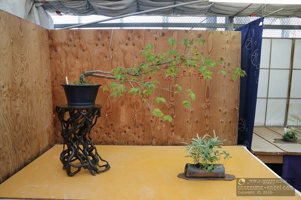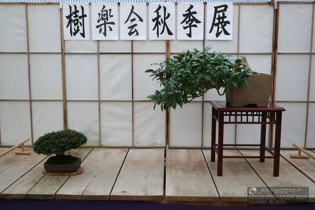 秋は植物観賞に良い季節ですが、盆栽にも同様です。松柏や雑木はもちろん、春とは異なり紅葉や実ものを観賞することができます。今回も樹楽会の皆さんが、日ごろから大事に育てた盆栽を席飾りにて飾って下さいました。いくつかの作品を写真にてご紹介致します。